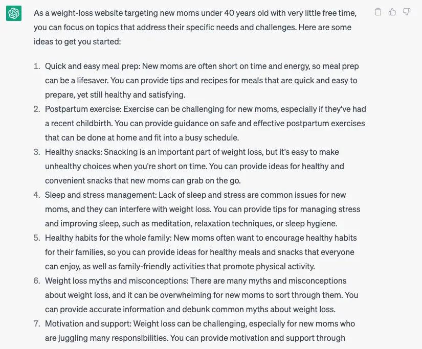 But in the following example, I used a lot of market data for my fictional site, specifying my audience was “I run a weight-loss website targeting new moms under 40 years old with very little free time, what high-performing topics should I write about?”: