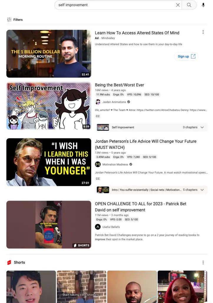 For instance, if you create content about self-improvement, go on YouTube and type in “self-improvement,” then filter by views. You can instantly see what the highest-performing topics are, and the exact headlines, thumbnails, and scripts your niche’s top influencers have chosen to use.