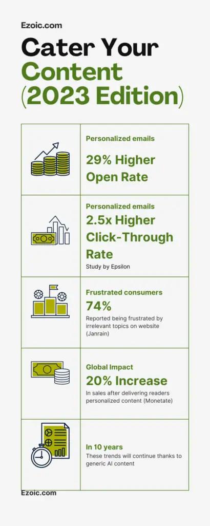 When it comes to website readers and content consumers, the numbers reveal a stronger case for personalized content. A [survey by Janrain](https://www.janrain.com/resources/regulation-consumer-identity-preferences-survey-report) found 74% of online consumers get frustrated with websites that feature content that has nothing to do with their interests. HubSpot found personalized calls-to-action had a [42% higher click-through rate](https://blog.hubspot.com/marketing/personalization-guide) than generic ones. A report by Monetate revealed that personalized content can lead to a [20% increase in sales](https://www.monetate.com/resources/personalization-infographic).