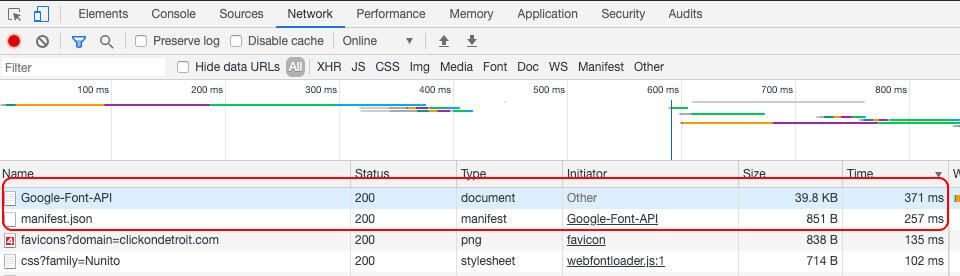> **EX:** When I ran the Google Lighthouse performance audit on the site above, you can see that when sorted by time, Google Font API took 371 milliseconds to load. While this is roughly only a third of a second, it was the slowest item in terms of load speed.