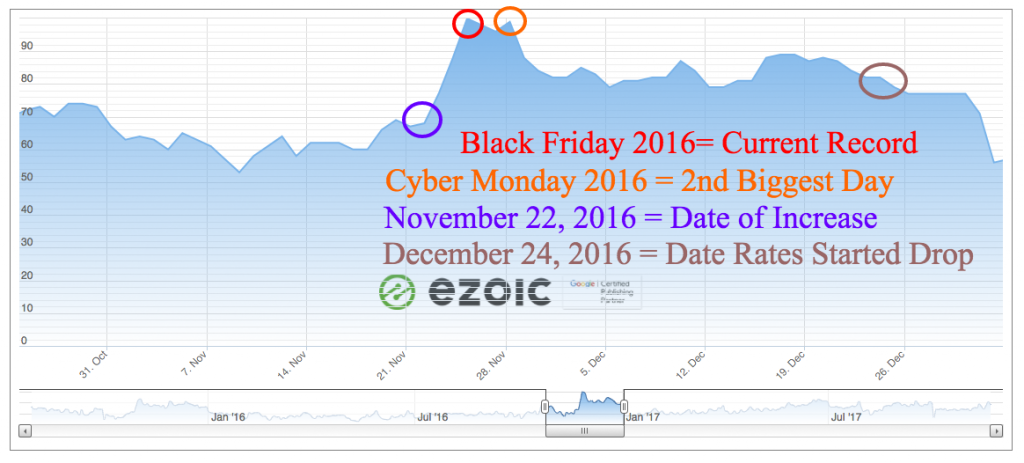 Black Friday has traditionally marked a point at which advertisers expend the largest portions of their budgets to capitalize on holiday spending. This increased competition leads to higher earnings for publishers, and we see once again this year, that digital spending and competition is on the rise. This continues to benefit digital publishers.