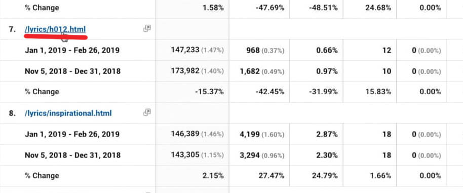 The top landing page’s traffic is fine in this example and hasn’t seen a significant decrease, so the drop is not a result of our most popular page. As we scroll down, we can see some pages are gaining traffic while others are losing traffic.