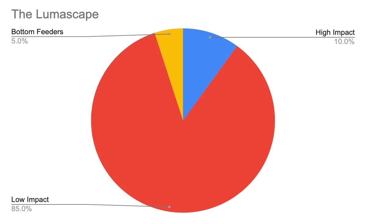 My estimation is that 85% of the companies are low-impact in terms of the value they ultimately provide in comparison to the high-impact parties (like Google AdX and Ad Manager). Ultimately, less than 10% fall into the high-impact category.