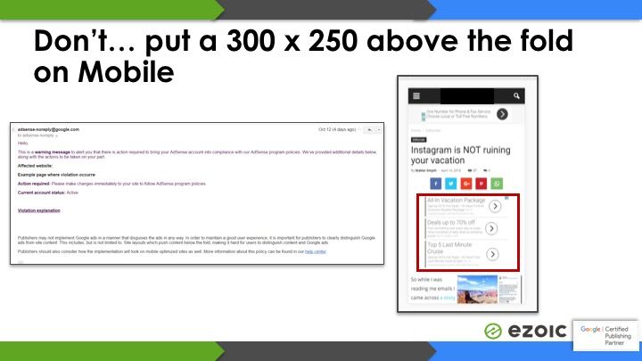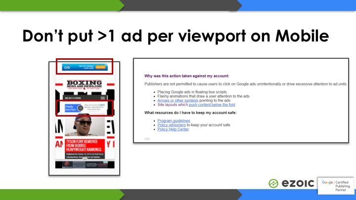 This is another violation that a lot of publishers aren’t aware of; or are in current AdSense policy violation of. Many set their ads on desktop and don’t realize how these ads are truly displaying on mobile. **This is one of the most common violations we see.**