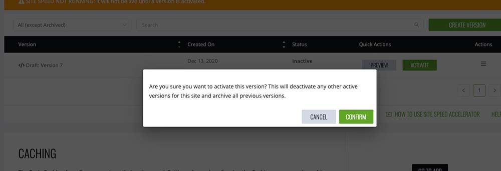 Then, we created a new version of the Site Speed Accelerator and selected the recommended settings.