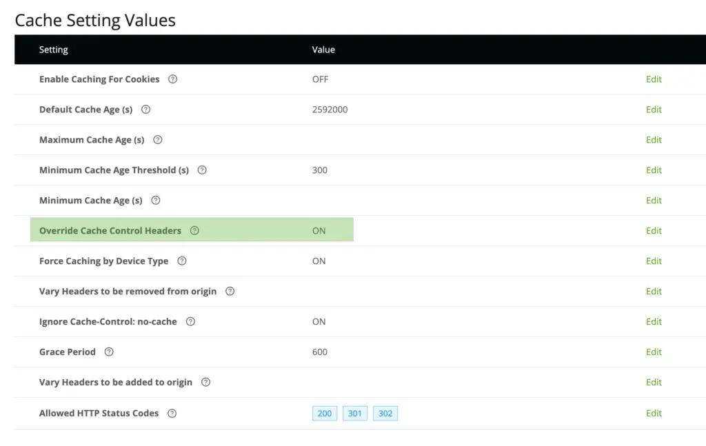 To override these cache settings, go to the Caching App and find find ‘Override Cache Control Headers.’ After selecting edit, change the settings to ‘ON.’
