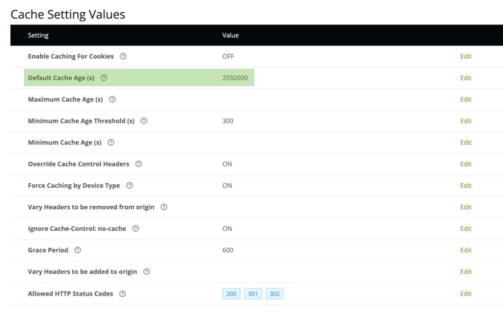 If you want to increase the cache age, navigate to the Caching App and scroll down to ‘Default Cache Age,’ where the minimum is 3,600 (1 hour).