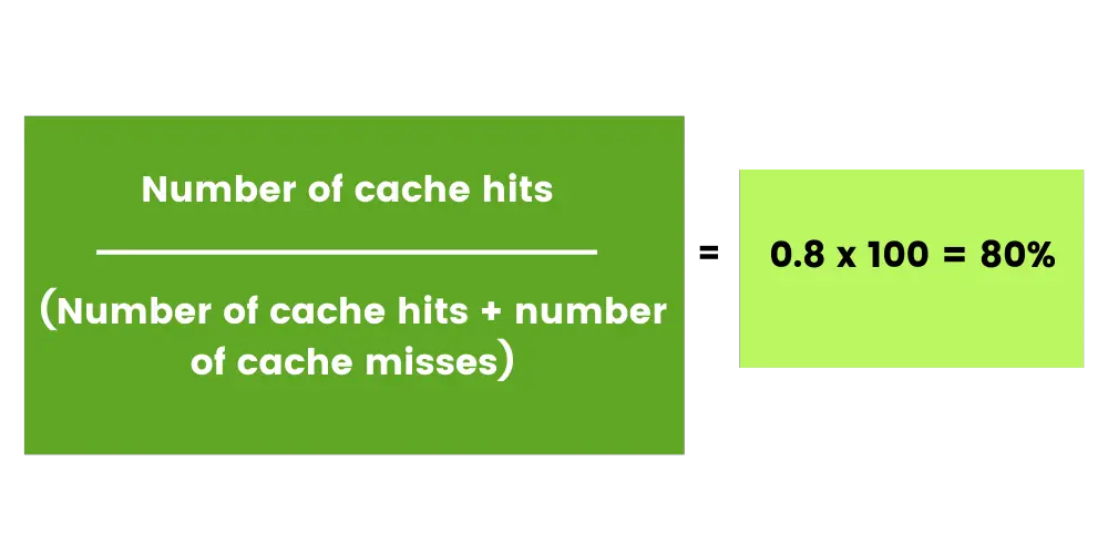 The cache hit ratio is often presented as a percentage, so you would simply multiply the cache hit ratio by 100 to get the percentage. For example, if a CDN has 20 cache hits and 5 cache misses, then the formula would look like the following: