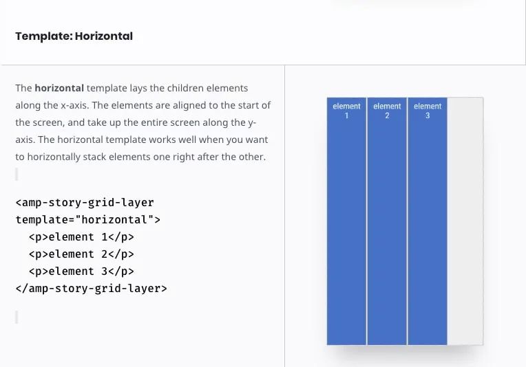 The AMP Stories guide will also help you understand the pieces and steps of an AMP story by walking you through some of the code and visuals, element animation, and the different templates available, though I will be using some visuals from the guide here.