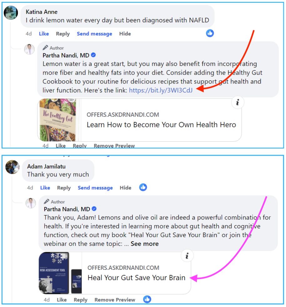 Here are some examples of varied types of posts with Infinity Engager responding to commenters prompting them to sign up for the newsletter: