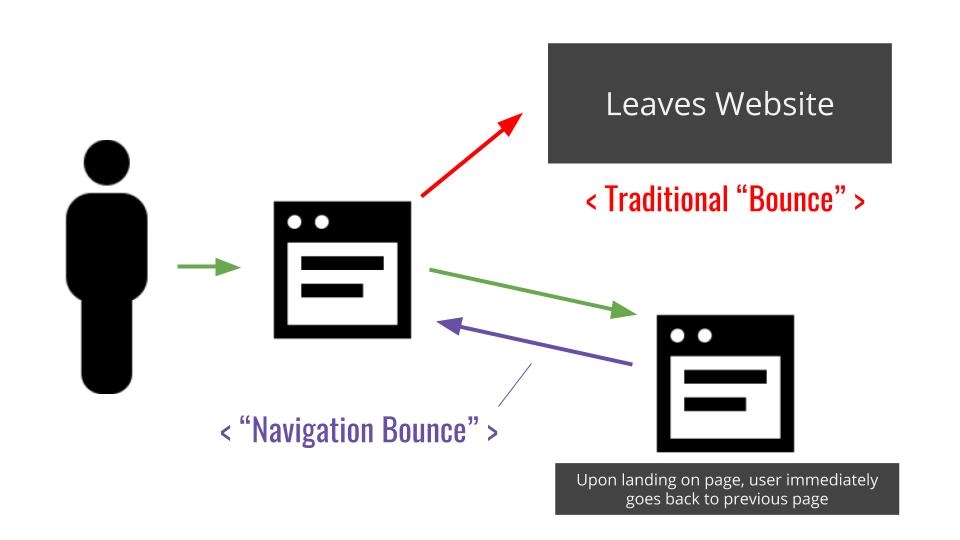 > Navigation bounces are similar to a regular bounce where it tracks a user exiting quickly, but takes a more internally targeted approach. A navigation bounce tracks internal bounces over different pageviews. It looks at pageviews during a user session in which a user may go to the next page; only to quickly exit the site or navigate quickly to another page.