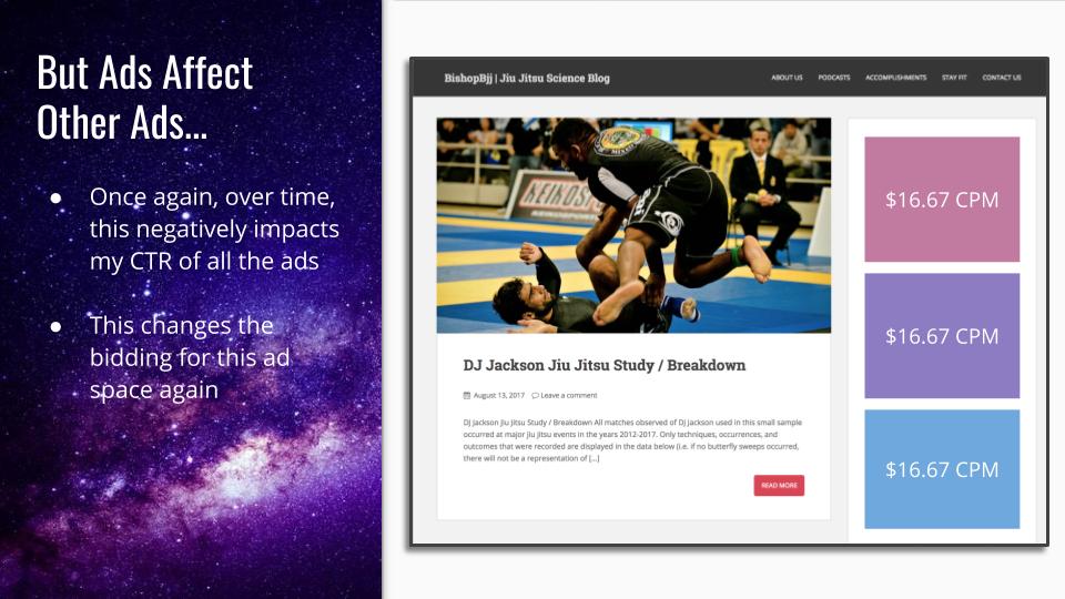 Unfortunately, ads have a strong impact on other ads — and a dramatic impact on visitor behavior. **Over time, those ads will dilute each other**; meaning that 1% CTR that ad space had will likely degrade. This means that the historical bidding data will change and advertisers will have bids automatically adjusted to compensate.