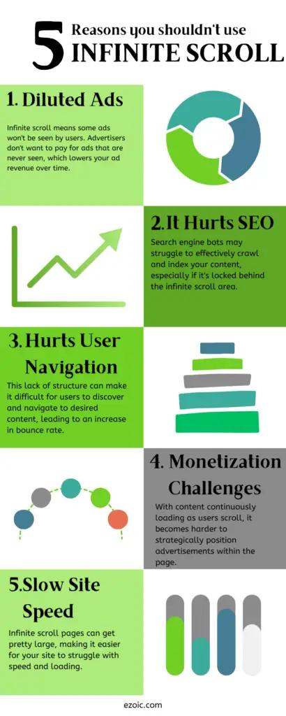 Infinite scroll leads to decreased value of ad impressions, which means lowered revenue, a poorer user experience, and a decline in overall site success.