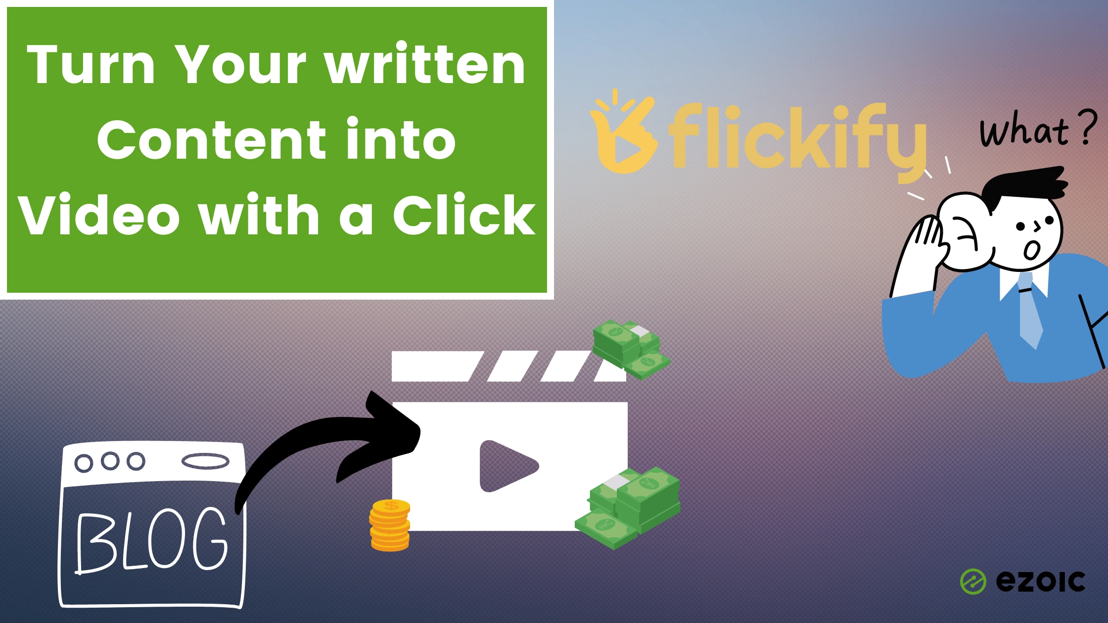 [Flickify](https://www.flickify.com/) (formerly Article to Video) is Ezoic’s video creation tool. Turn your articles into amazing videos in less than a minute! No need for fancy equipment or an expensive production crew — upload your article, select a narrator’s voice, choose your theme, add images or videos you have (or select from our curated library), and your video is ready.
