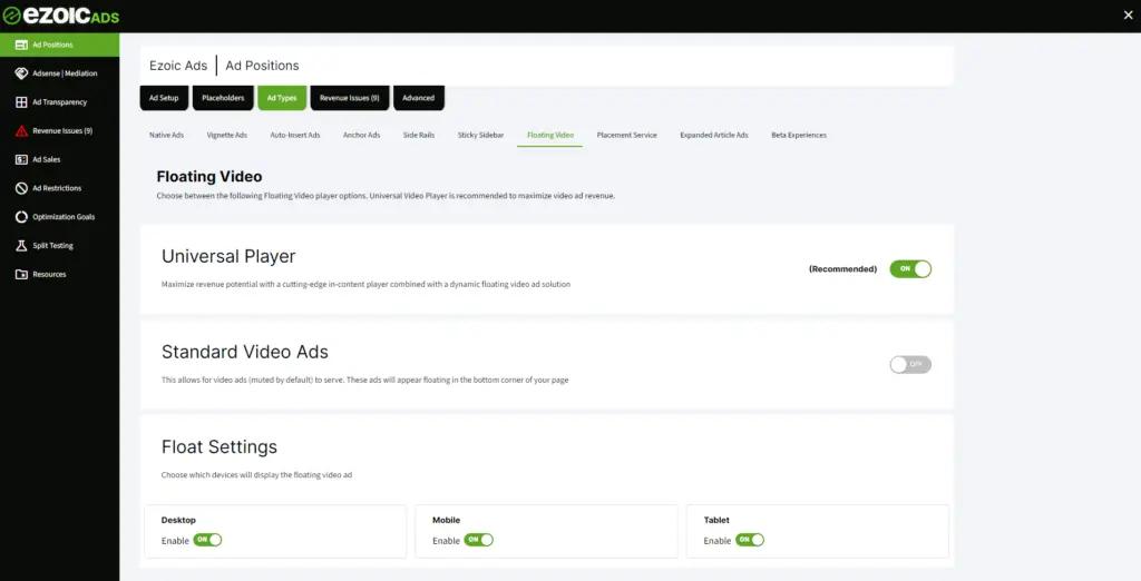 **Ezoic Ads:** If you haven’t yet adopted Humix, you can activate the Universal Player through the Ezoic Ads platform. Simply go to the Ad Types section and look under the Floating Video tab to enable it. If you’re already using our original floating video ad unit, please note that this setting will automatically deactivate once the Universal Player is enabled.