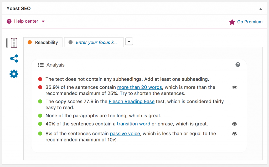 If you’re a WordPress user, you’ve likely already bumped into readability scores because Yoast SEO includes the Flesch-Kincaid test as one of its assessments of your writing. You might never have clicked on the “readability” tab but it offers some interesting data. Here’s an example from one of my own recent blog posts: