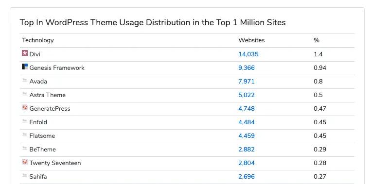 Additionally, the Genesis Theme, Avada, the Astra Theme, and GeneratePress were in the top 5.