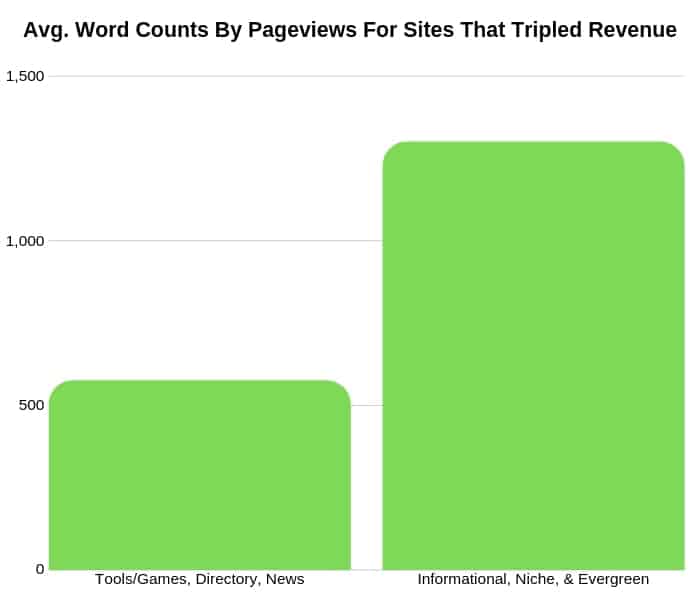 > For example, the majority of the content on the Niche Content, Informational Websites, and Evergreen Content sites that we reviewed saw word counts between 1,000-2,500 words. Meanwhile, the News, Tool/Game, and Directory sites had average word counts between 500-750 words.