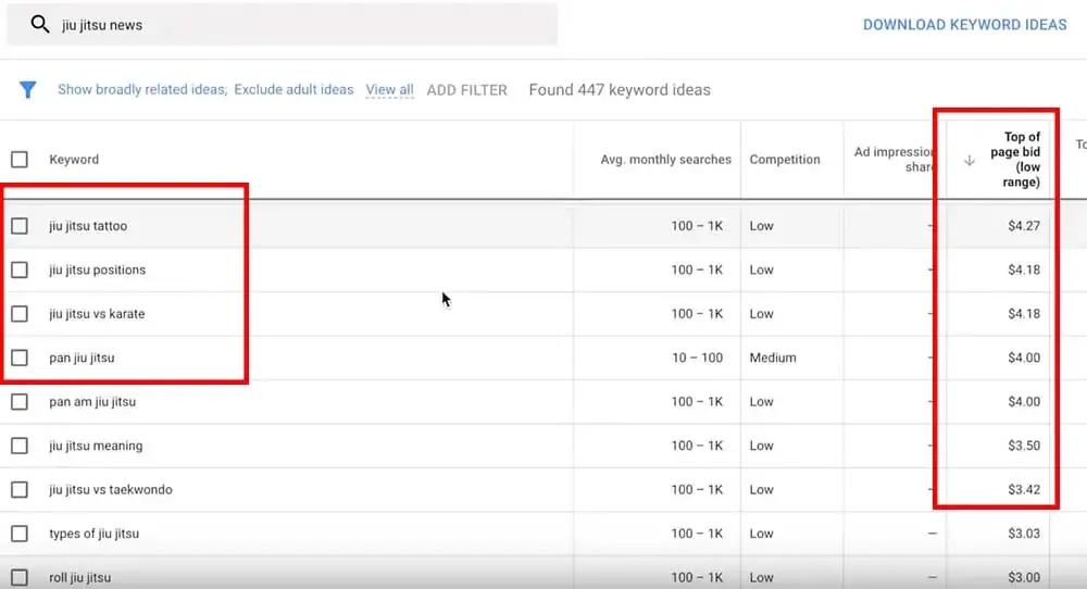 **Step 4:** From here, sort the results for ‘Top of page bid.’ As we can see, the highest-bidding topics are jiujitsu tattoo, jiujitsu positions, jiujitsu versus karate, and pan jiujitsu, which is a jiujitsu tournament.