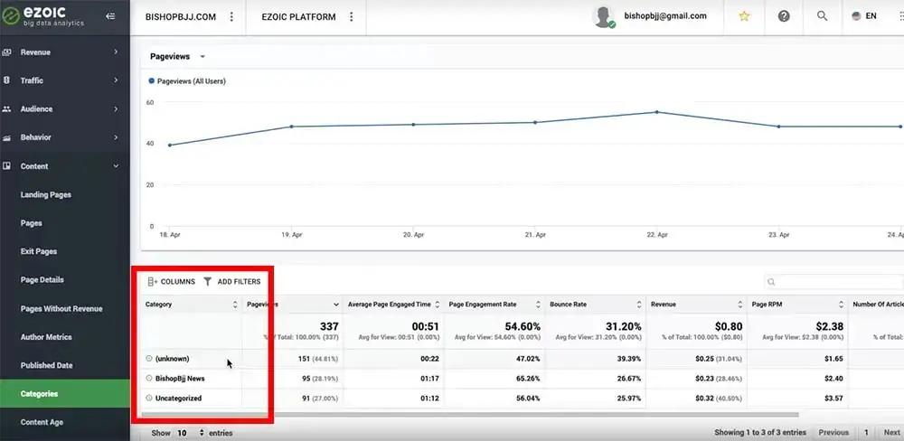 For Ezoic users, the [free Big Data Analytics](/?page_id=1761) application provides metrics on page and website performance, user and traffic trends, and much more. I’ll be walking you through Big Data Analytics and finding your categories and pages using my small jiu jitsu website as a simple example.