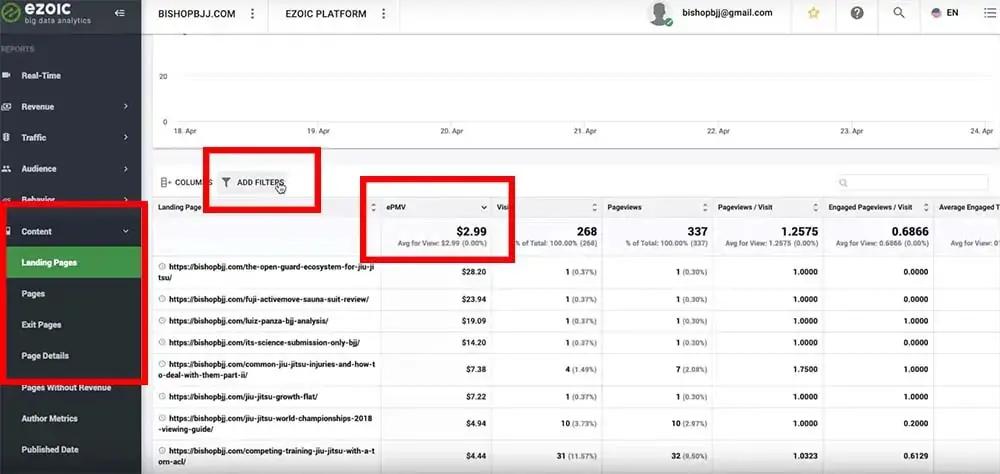 From here, it’s important to understand which articles on the site are earning the highest EPMV and why. Some sites will be making the bulk of their revenue from single page visits. This means that page is attracting a valuable audience and good engagement; thus advertisers bid for space on that page ([see how engagement translates to higher ad earnings here](https://blog.ezoic.com/engagement-time-important-top-publishers/)).