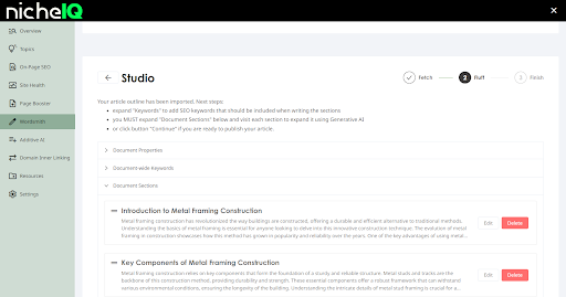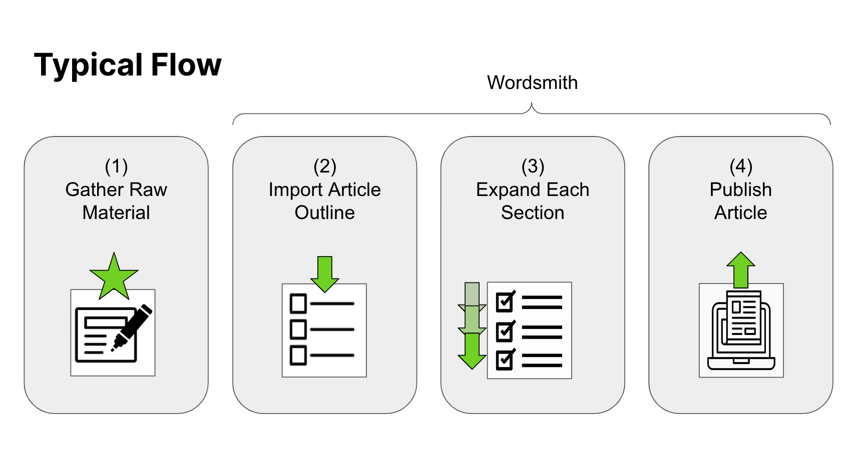 Once the raw material is collected, users import the outline into Wordsmith, where the magic begins. Wordsmith parses the outline and creates a section for each heading, providing users with a structured framework to work within.